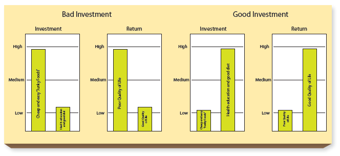 You may be scratching your head, wondering what I’m talking about, and if you think investments aren’t “your thing”, please don’t tune me out yet. Because I’m talking about investing the resources we have in life itself–especially the health of you and your family. These investments aren’t as measurable as purely financial assets, and returns are difficult, if not impossible, to calculate, but they are just as real. To give you an example of a non-monetary investment we all make, consider the idea of an emotional investment. You’ve probably experienced “setting your heart” on a hope of something particular happening. If it doesn’t come about, you lose the emotional investment. Going out to dinner and a movie, even if it includes popcorn and ice cream, while perhaps as enjable as a day at the park, doesn’t salve the pain if you’ve spent the past month living for a trip to the zoo, imaging the fun things you would see and do. You’re doing something nice, but you’ve lost that emotional investment. And the sense of loss is very real. We each invest all the time, in lots of non-monetary ways. So it’s important to take stock of these investments to make sure we’re investing in the right things.